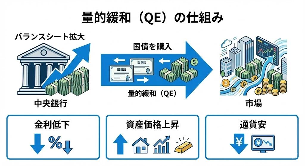 仕組み中央銀行が国債などの資産を大量に買い入れ、市場に資金を供給します。