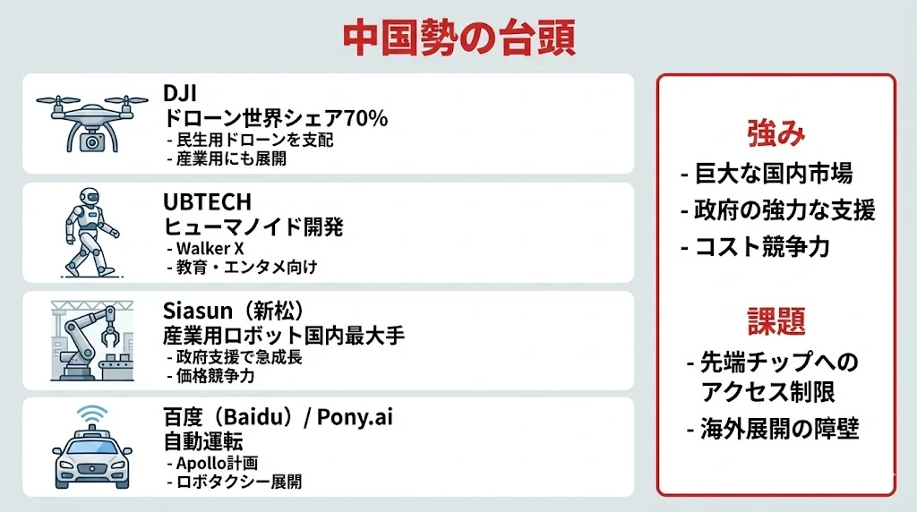 - 中国勢:国内市場と政府支援が強み、地政学リスクが課題