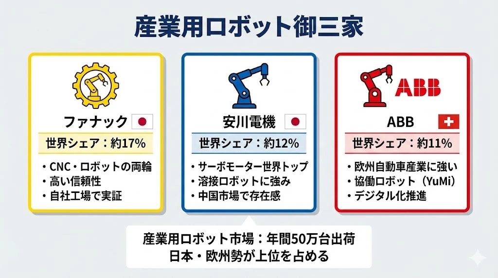 産業用ロボット市場は、ファナック、安川電機、ABBの御三家が長年リードしてきました。