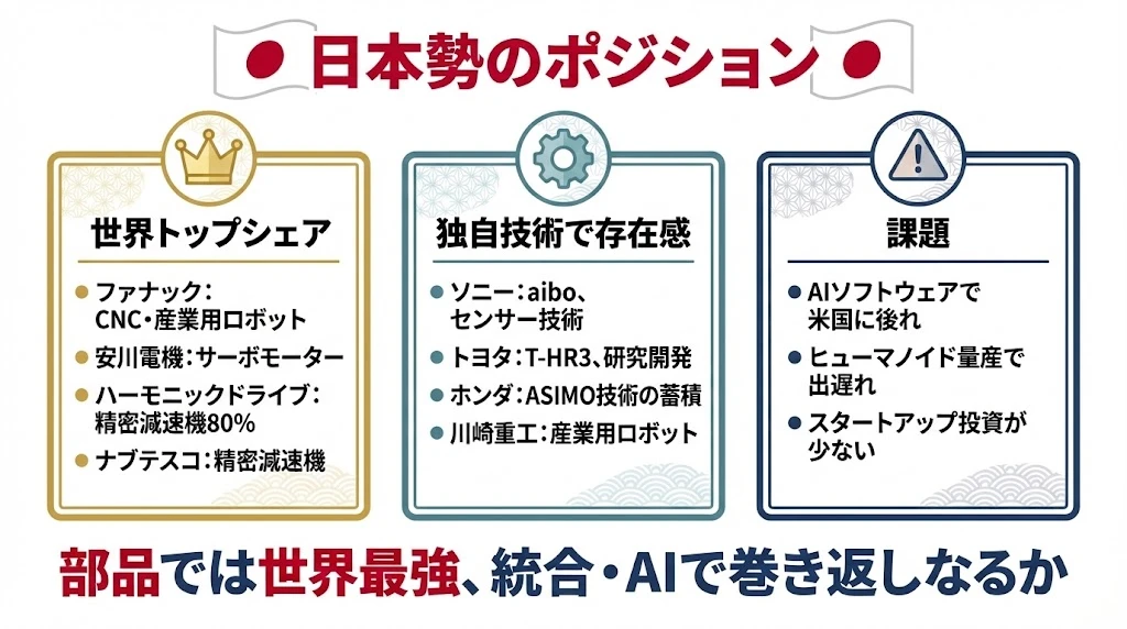 精密部品(減速機、モーター)では圧倒的な強みを持つ一方、AI・ソフトウェア・ヒューマノイドでは米国勢に後れを取っています。