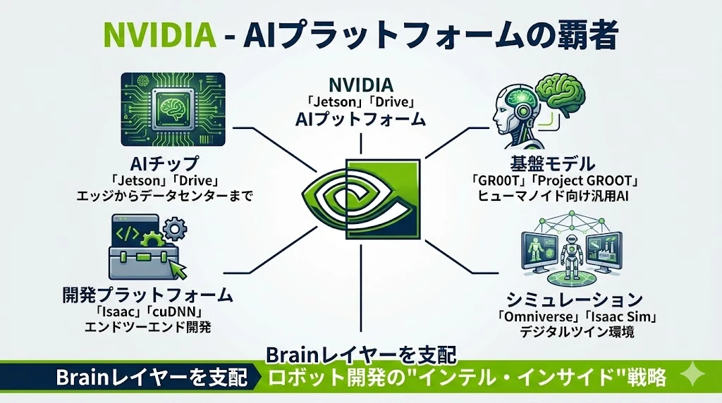 NVIDIAは、フィジカルAI業界の「Brainレイヤー」を支配する最重要プレイヤーです。