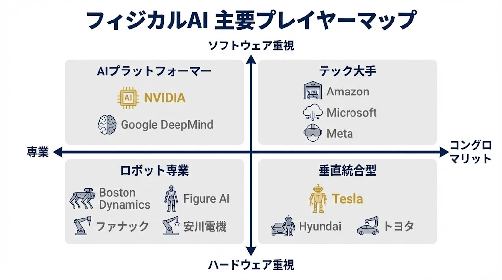 フィジカルAI業界の主要プレイヤーを、2つの軸でマッピングします。