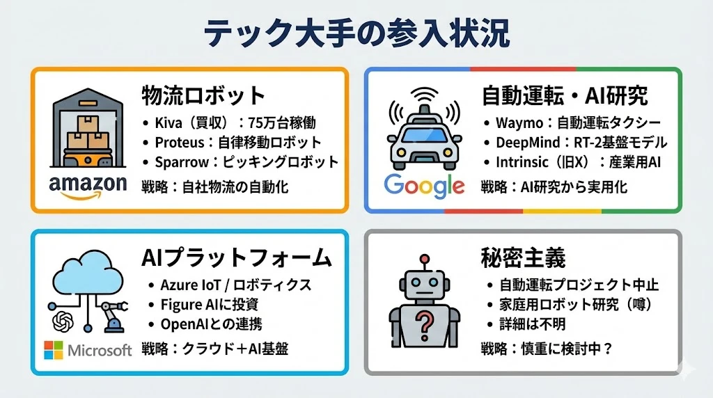 - テック大手:Amazon(物流)、Google(AI研究)、Microsoft(クラウド)がそれぞれの強みで参入