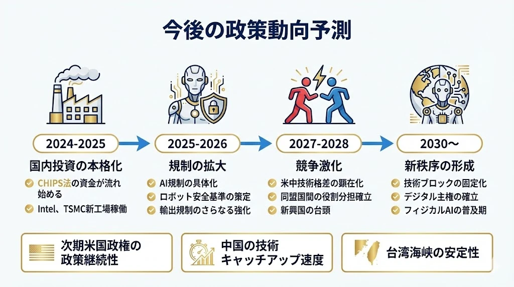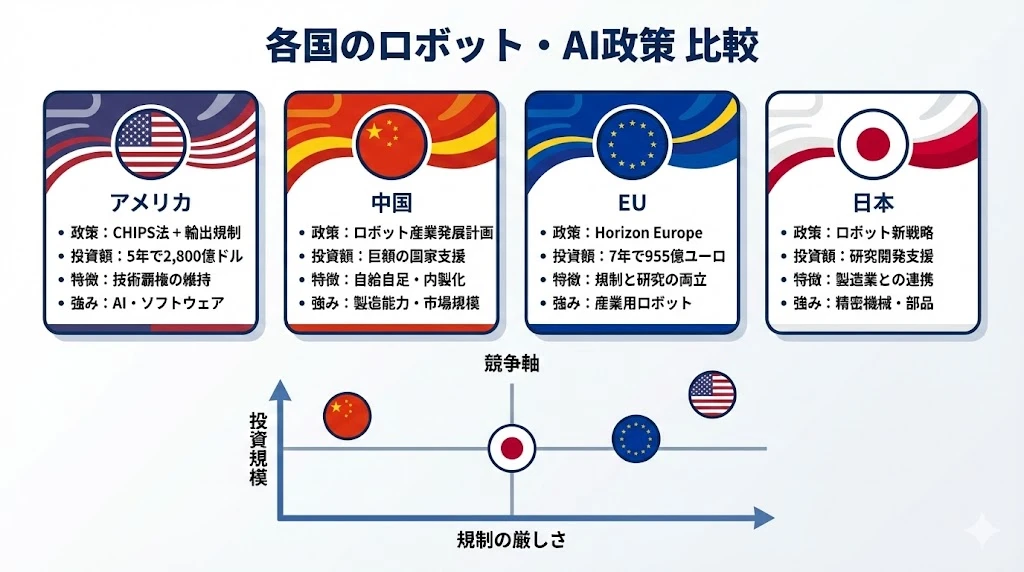 - 各国政策:米国(技術覇権)、中国(自給自足)、EU(規制と研究)、日本(製造業連携)で異なる