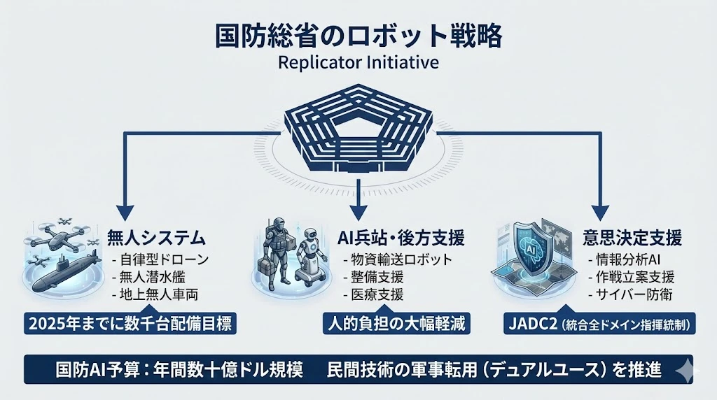 米国国防総省(DoD)は、Replicator Initiativeを中心にロボット・AI戦略を推進しています。