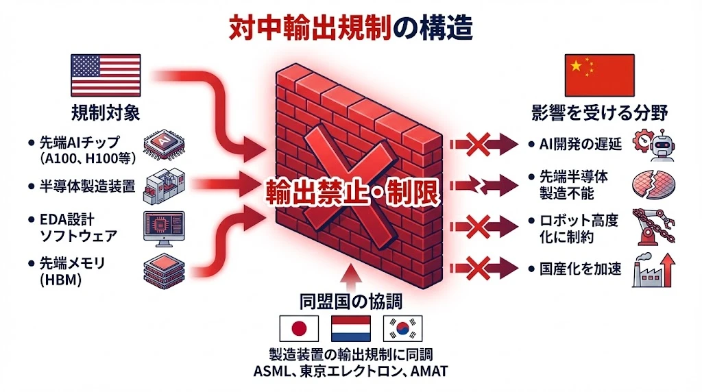 - 対中輸出規制:先端AIチップ、製造装置、設計ソフトを規制、同盟国も協調