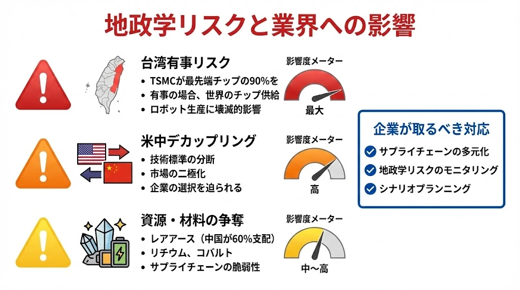 - 地政学リスク:台湾有事(最大)、米中デカップリング(高)、資源争奪(中〜高)