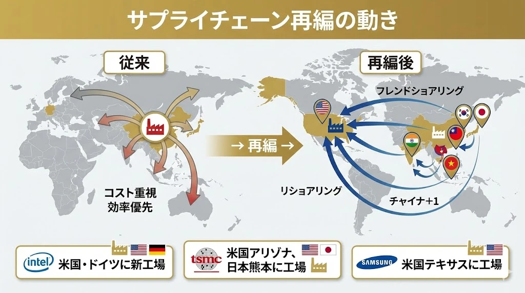 - サプライチェーン再編:リショアリング、フレンドショアリング、チャイナ+1が進行