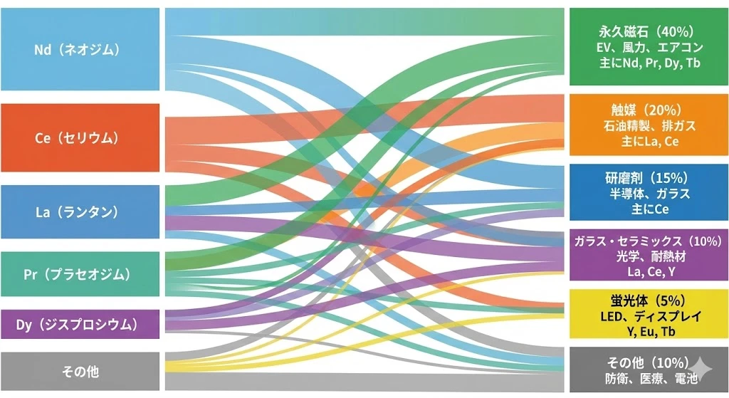 - ネオジム(Nd):世界最強の永久磁石の主成分、需要量最大