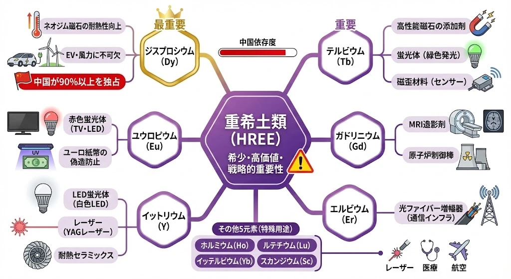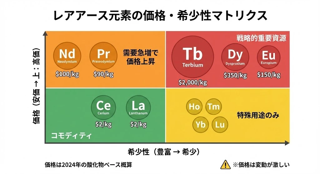 | 戦略的重要資源 | Tb, Dy, Eu | $150〜2,000/kg | 希少・高価・中国依存 |