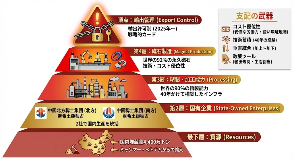 中国がレアアース市場を支配できる理由は、以下の4つの優位性にあります。