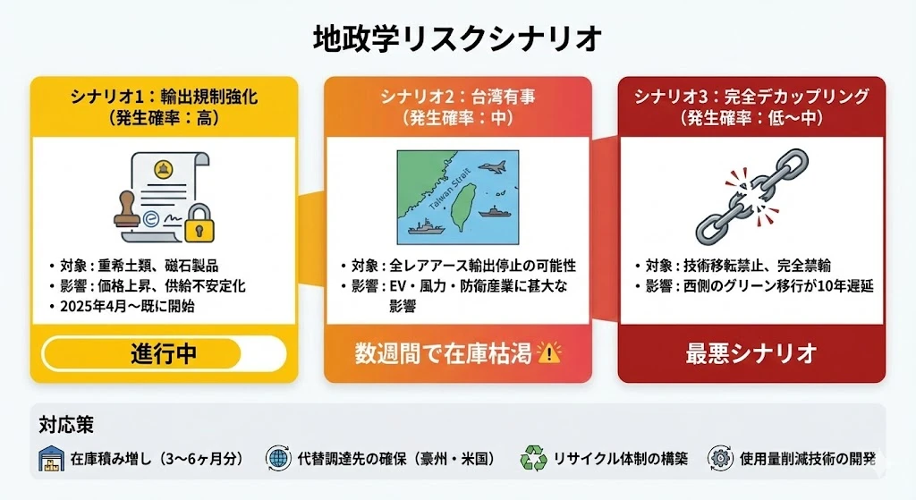 多くの企業は3〜6ヶ月分のレアアース在庫しか持っていません。中国からの供給が完全に停止した場合、数週間で在庫が枯渇する企業も出てきます。