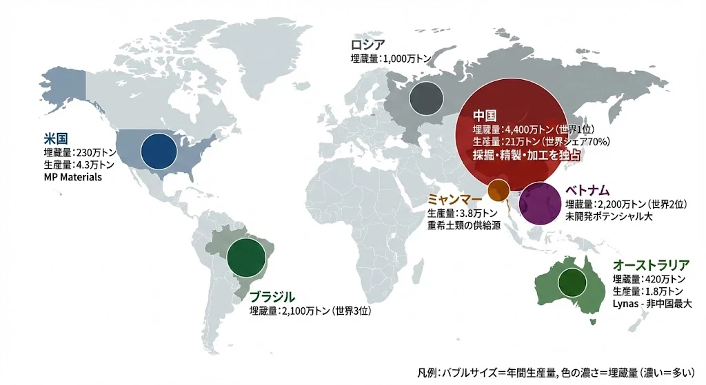 ベトナムやブラジルは埋蔵量では上位ですが、生産はほとんど行われていません。これは採掘・精製のインフラが整っていないためです。