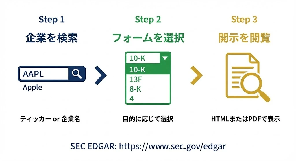 SEC EDGARにアクセスし、ティッカーシンボル(例:AAPL)または企業名で検索します。