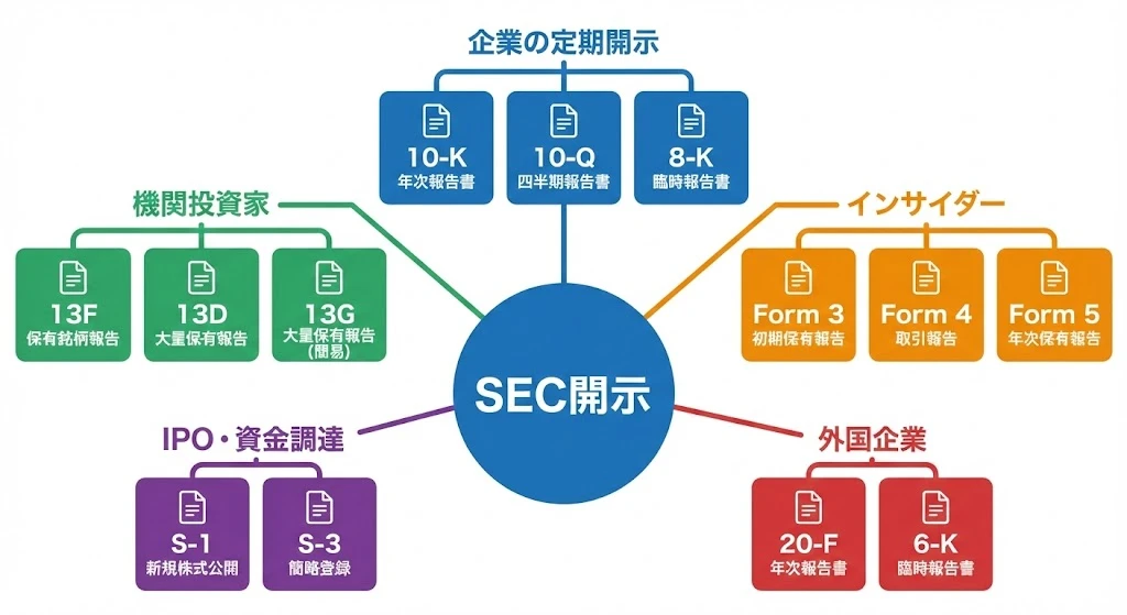 - SEC開示は5カテゴリ:企業定期開示、機関投資家、インサイダー、IPO、外国企業