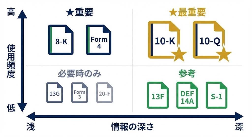 SECには数十種類のフォームがありますが、個人投資家が知っておくべきものは限られています。まず全体像を把握しましょう。