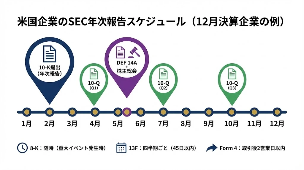 米国企業の開示には一定のリズムがあります。12月決算企業を例に、年間スケジュールを見てみましょう。