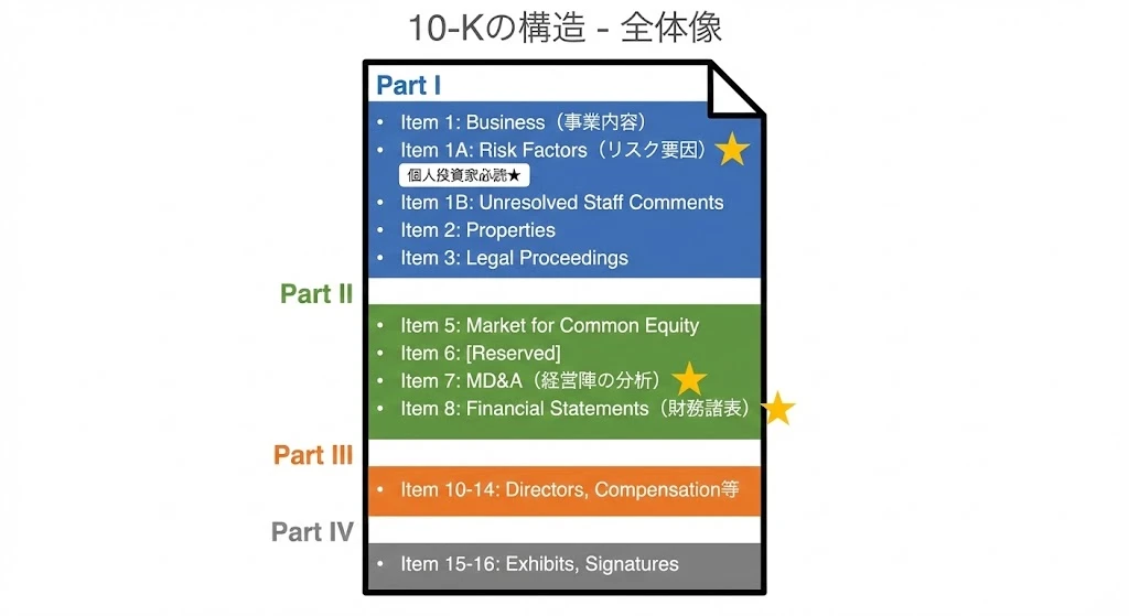 個人投資家が必ず読むべきはItem 1A(Risk Factors)、Item 7(MD&A)、Item 8(Financial Statements)の3つです。