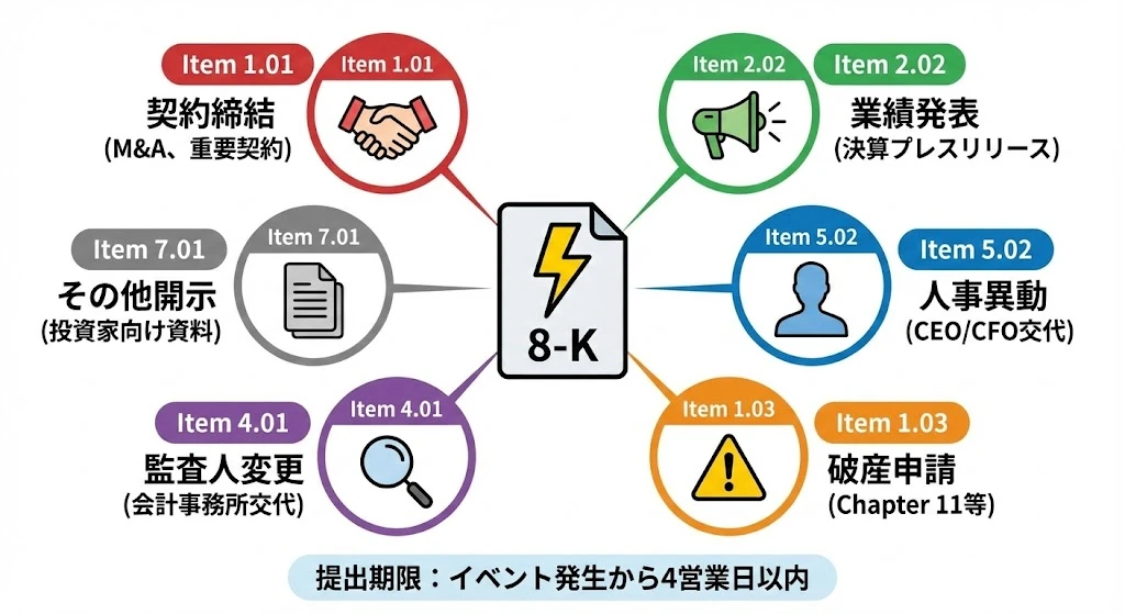 - 8-Kは臨時報告書。重大イベントを4営業日以内に開示
