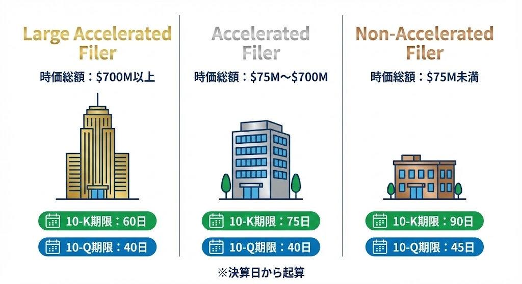 | Large Accelerated Filer | $700M以上 | 60日 | 40日 |