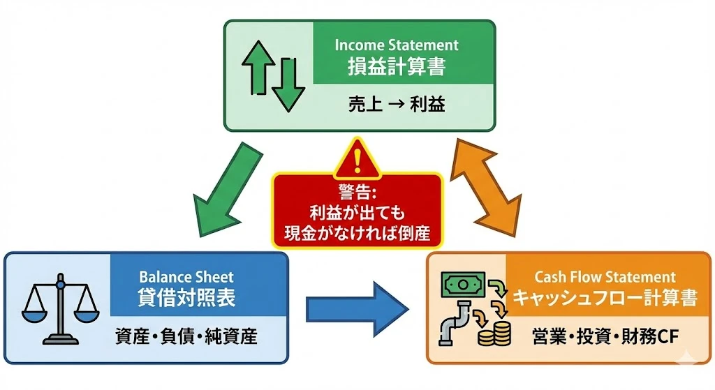 利益が出ていても現金がなければ倒産します。損益計算書だけでなく、キャッシュフロー計算書も必ず確認しましょう。