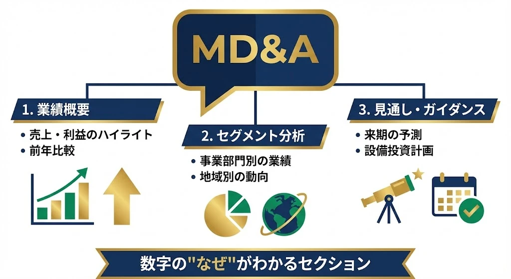 MD&A(Management's Discussion and Analysis)は、経営陣が自社の業績について自らの言葉で解説するセクションです。財務諸表だけではわからない「なぜ」がここでわかります。