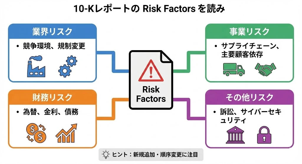 Risk Factorsは、企業が認識しているビジネス上のリスクを開示するセクションです。一見ネガティブな内容ばかりですが、ここには企業の本音が隠れています。
