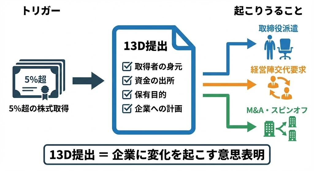 - 13Dは5%超保有のアクティビスト投資家が提出