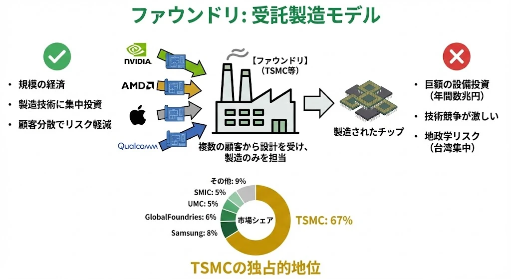 | ファウンドリ | 製造のみ、受託生産 | 規模の経済 | TSMC, GlobalFoundries |