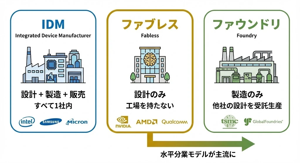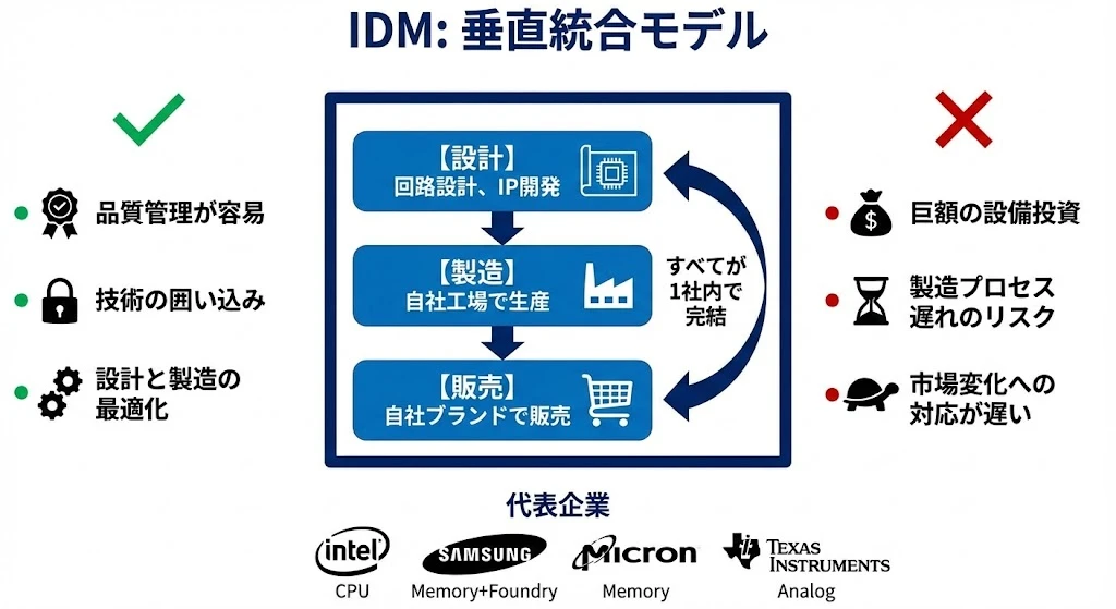 | IDM | 設計から製造まで一貫 | 垂直統合 | Intel, Samsung, Micron |