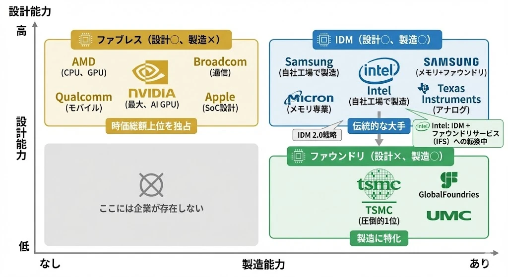 | 設計能力高 | ファブレス(NVIDIA、AMD、Qualcomm) | IDM(Intel、Samsung、Micron) |