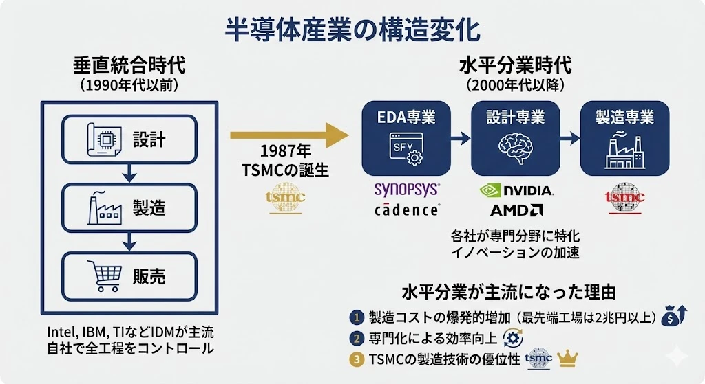 半導体産業は、かつては垂直統合(IDM)が主流 でした。Intel、IBM、Texas Instrumentsなど、大企業が設計から製造まで自社で行っていました。