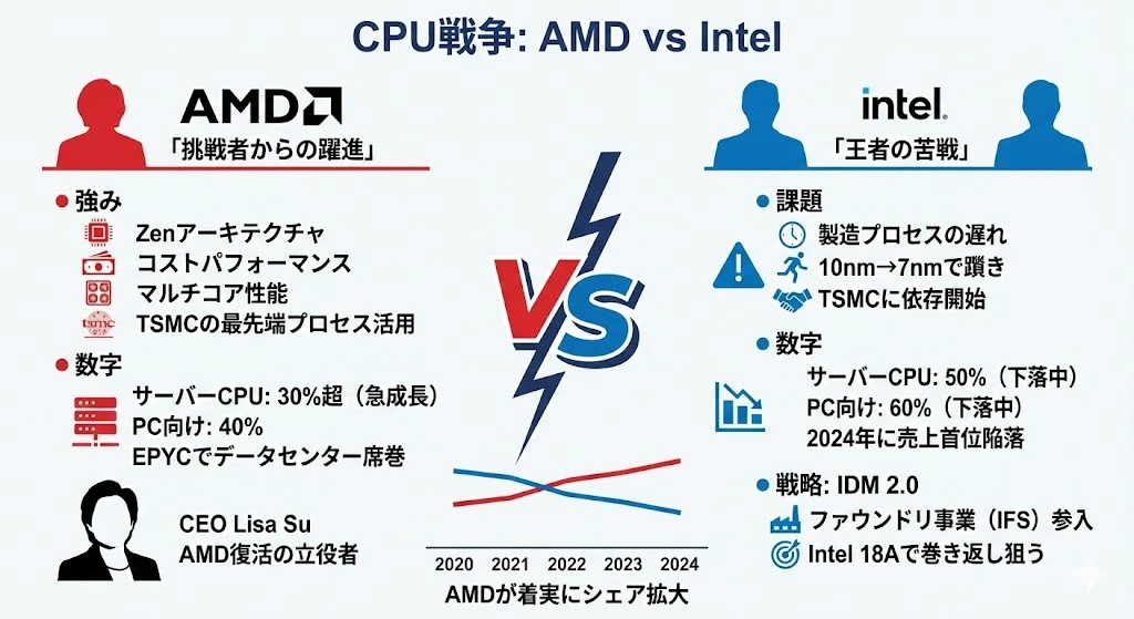 | 製造プロセス遅れ | 10nm→7nmで躓き、TSMCに抜かれる |