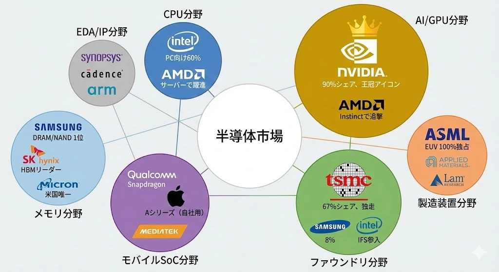 半導体業界は寡占構造 が特徴です。各分野で1〜3社が市場を支配しており、新規参入は極めて困難です。