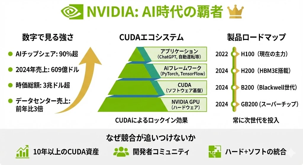 - NVIDIA:AI GPU独占、CUDAエコシステムで競合を圧倒