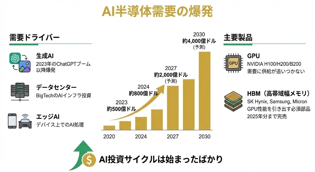 AI半導体市場は年率30%以上 で成長し、2030年には4,000億ドル規模に達する見込みです。