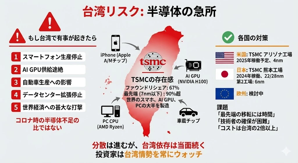 最終回となる本記事では、投資家が知るべきリスク要因 に焦点を当てます。AI需要の爆発、米中対立、台湾リスク——半導体投資には大きなリターンの可能性がある一方で、無視できないリスク も存在します。