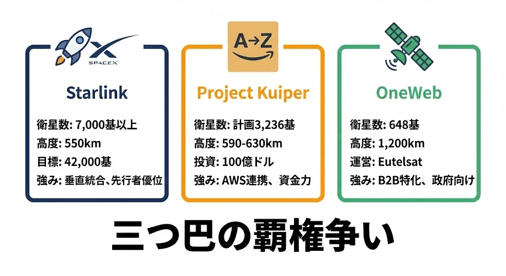 | 運営企業 | SpaceX | Amazon | Eutelsat OneWeb |