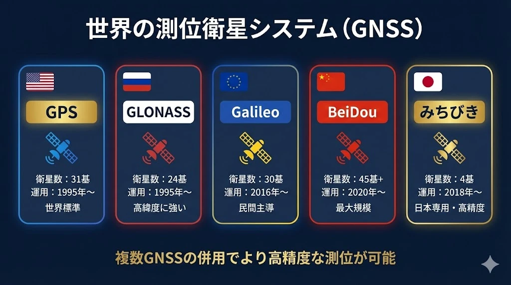 - 世界には5つの主要GNSS(GPS、GLONASS、Galileo、BeiDou、みちびき)が存在