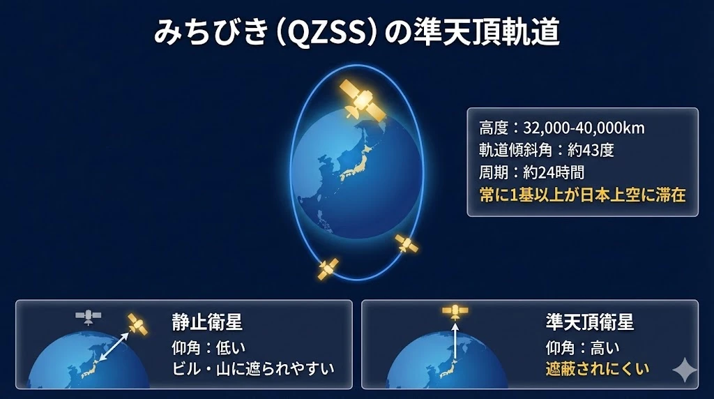 通常の静止衛星は赤道上空に固定されますが、みちびきは8の字軌道を描くことで、日本の真上(天頂)付近に長時間滞在します。これにより、山間部や都市部でも真上からの電波を受信でき、測位精度が向上します。