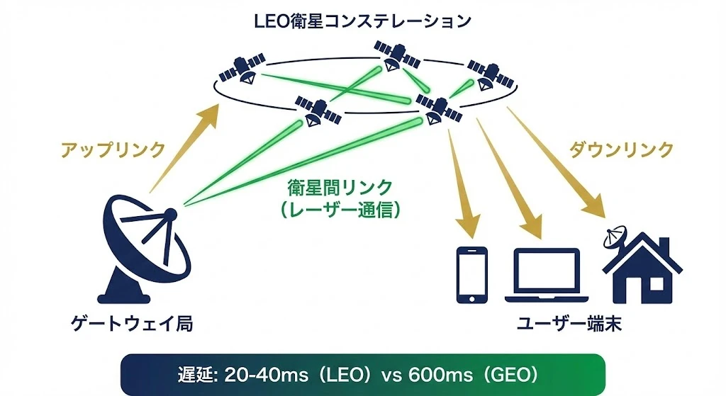 - LEO衛星通信は遅延約20-40msで、GEO(約600ms)より大幅に低遅延