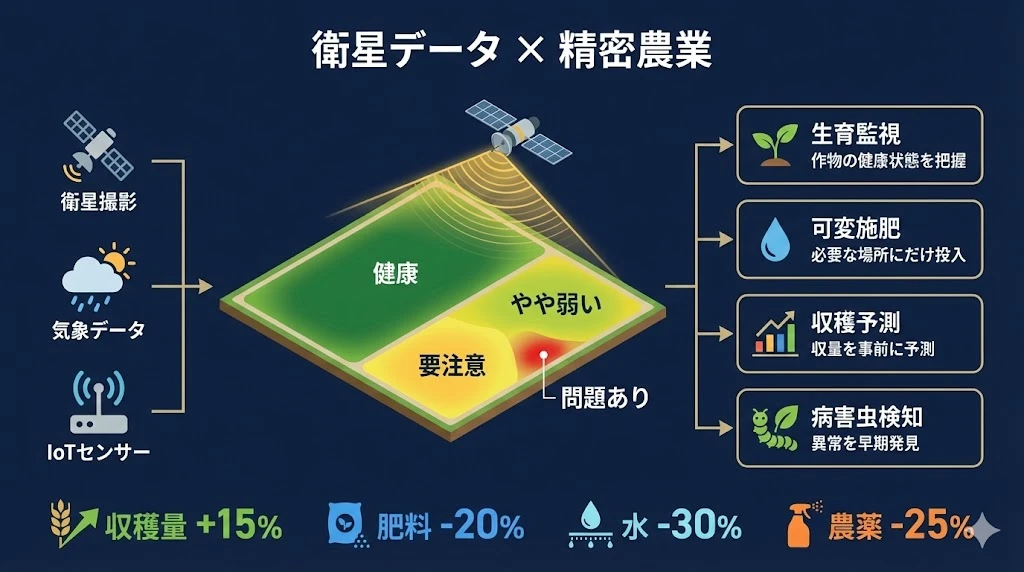 - 精密農業では衛星データで収穫量10-15%向上、肥料20%削減が可能