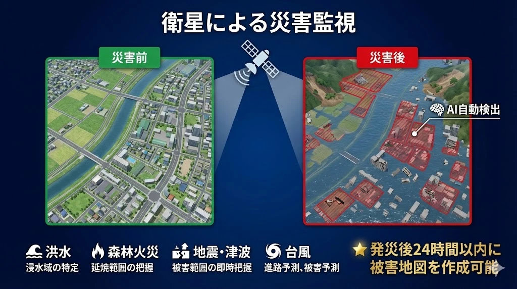 地球観測衛星は、災害対応において極めて重要な役割を果たしています。