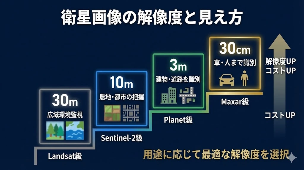 衛星画像の「解像度」は、どれだけ細かいものまで識別できるかを示します。解像度によって、見えるものと用途が大きく異なります。