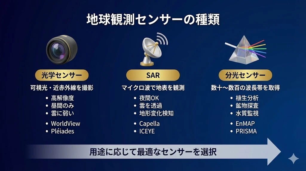 - 地球観測センサーは光学、SAR、分光センサーの3種類に大別される