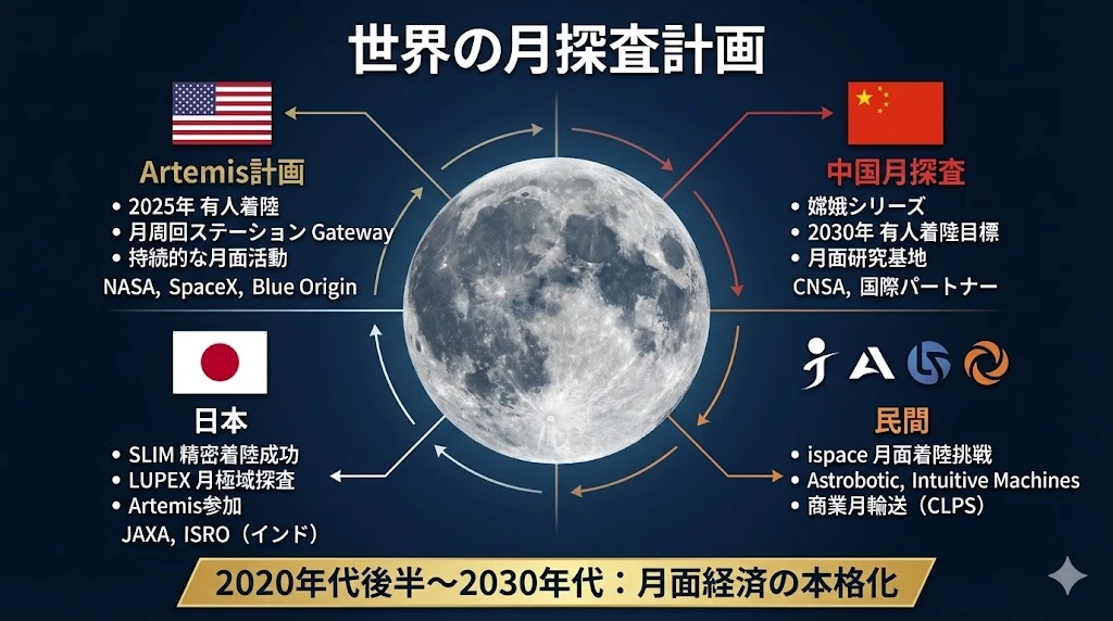 NASAのArtemis計画は2025年に有人月面着陸を予定し、中国も2030年までの有人月面着陸を目標としています。民間企業のispaceやIntuitive Machinesは月面着陸に挑戦し、SpaceXは火星移住を本気で計画しています。