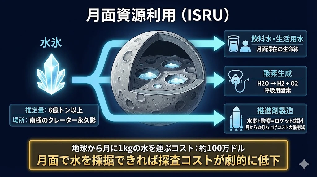 | 推進剤製造 | 水素+酸素=ロケット燃料 | 月からの打ち上げコスト削減 |