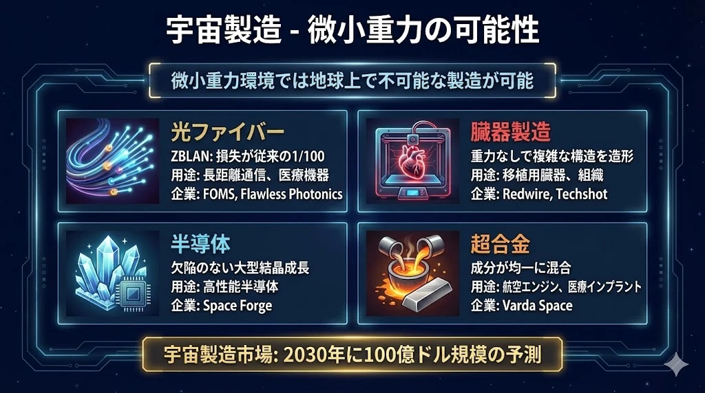 - 宇宙製造(ZBLAN、バイオプリンティング等)は2030年に100億ドル市場へ