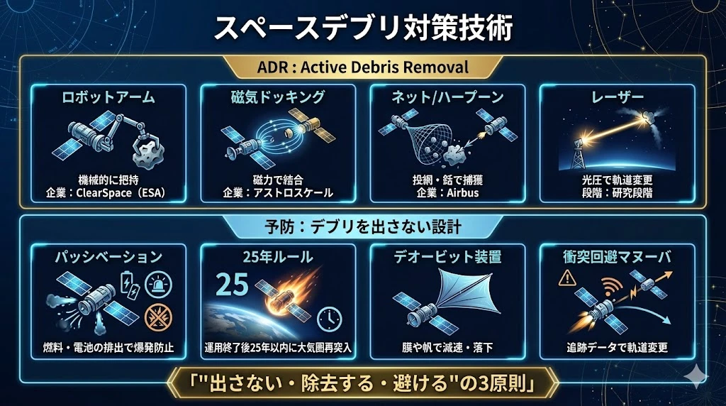 | 技術革新 | デブリ除去、衛星修理、パッシベーション |
