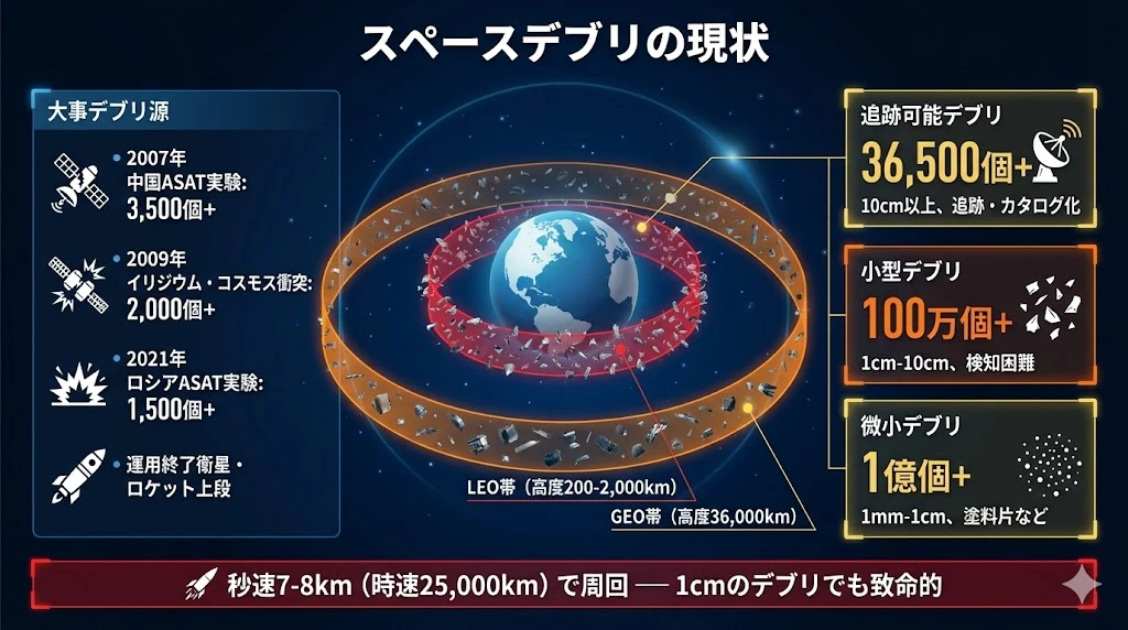 - スペースデブリは36,000個以上が追跡され、1cmでも衛星に致命的